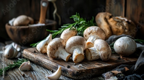 Fresh mushrooms and greens on wooden cutting board in kitchen with natural rustic cooking scene
