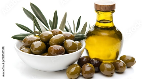 olive, olive oil, bottle, green, food, healthy, diet, mediterranean, cookery, cooking, ingredient, fresh, natural, delicious, tasty, epicure, organic, produce, bowl, leaf, tree branch, plant, white, background, still life, photo, image, picture, photo, visual, composition, arrangement, closeup, detail, bright, vibrant, colours, oil, liquid, glasses