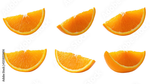 Fresh orange slices arranged artistically on a white background, showcasing vibrant colors and juicy texture