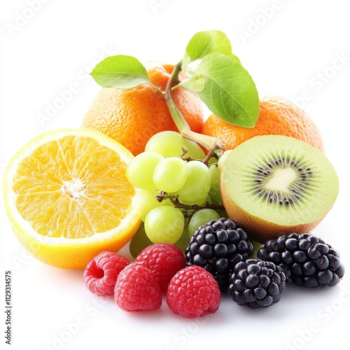 Fresh oranges, kiwi, grapes, raspberries, and blackberries on white background.