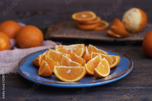 Fresh oranges on ceramic plate on vintage background. Vintage still life with oranges.