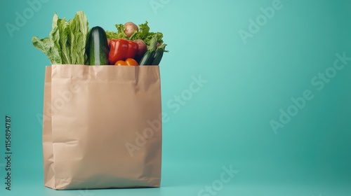 Fresh Organic Vegetables in a Brown Paper Bag Against a Bright Turquoise Background for Healthy Eating and Sustainable Lifestyle Concepts