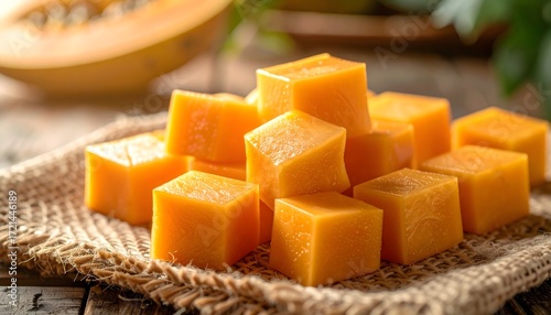 papaya, cube, chunk, fruit, tropical, ripe, fresh, juicy, sweet, gold, organic, exotic, dessert, healthy, nourishment, vibrant, raw, natural, delicious, texture, snack, summer, food, cheese, isolated, white, yellow, pumpkin, orange, vegetable, cube, slice, cut, chopped, plate, piece, melon, dairy, caramel, diet