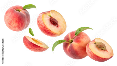 peach, fruit, slice, whole, fresh, nature, food, healthy, organic, summer, flying, colourful, agriculture, vegetarian, sweet, alimentary, harvest, farming, produce, dessert