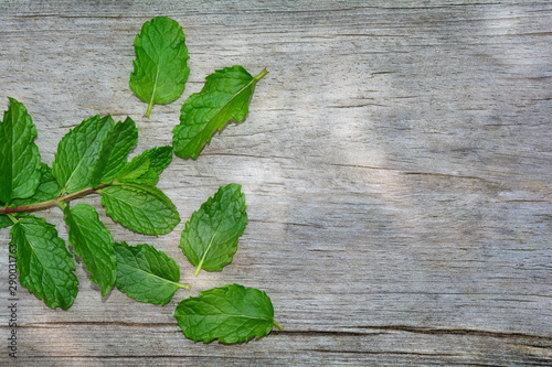 Fresh peppermint leaves on bright old wood with copy space
