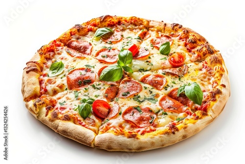 Fresh pepperoni pizza with basil on white background. Neural network AI generated