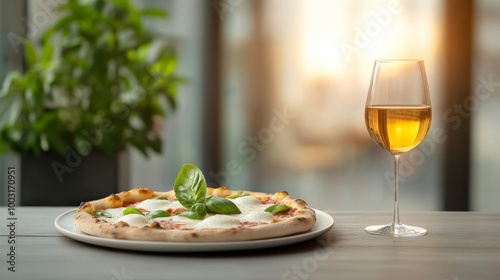 pizza, wine, basil, dining, eatery, food, epicure, meal, glasses, interior, table, wood, fresh, cookery, casual attire, elegant, beverage, herb, italian, slice, nourishment, culinary, refreshment, dish, summer, healthy, party, tableware, hand-made, cheerful, bright, intimate, warm, closeup, green, decor, favor, brunch, snack, tasty, delicious, rustic, presentation, style