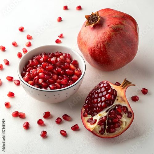 pomegranate, fruit, health food, fresh fruit, red fruit, bowl, sliced fruit, food photography, studio shot, closeup, food, healthy eating, nourishment, diet, vitamin, vitamin, healthy lifestyle, vegetarian, vegan, organic food, natural food, autumn, winter, thanksgiving, christmas, raw food, juicy, ripe, cut, slice, isolated, background, white background, studio photography, closeup, full frame, healthy snack, dietitian, dietitian