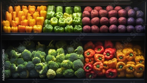 vegetable, produce, display, pepper, broccoli, potato, colourful, fresh, healthy, food, grocery, market, arrangement, organisation, freshness, natural, organic, alimentary, nutrient, vibrant, seasonal, stacked, packed, bright, yellow, green, red, purple, orange, brown, shelf, food market, aisle, supermarket, wholesome, good food, farming, harvest