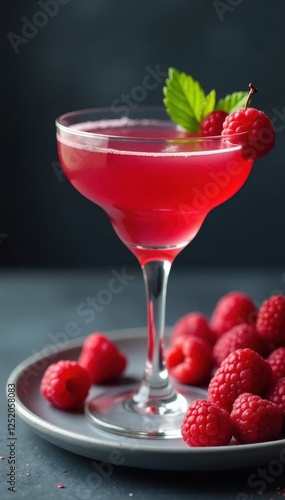 Fresh raspberries on gray plate next to a chilled glass of colorful French Martini cocktail, cocktail, fruit, beverage