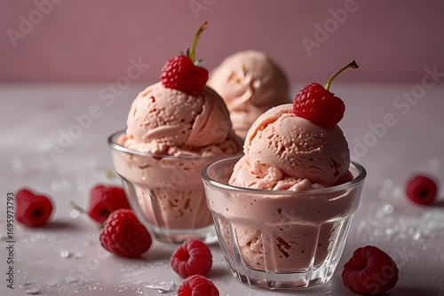 fresh raspberry style ice cream,pink background,in glass cup,some raspberrys on the ice cream