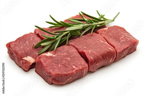 Fresh Raw Beef Cuts with Green Rosemary Sprigs on White Background for Culinary Use