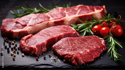 Fresh, raw beef steaks with rosemary, tomatoes, and peppercorns on a black slate board. A delicious and healthy meal option.