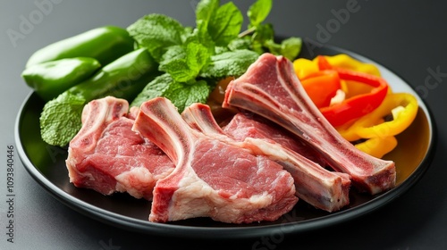 Fresh Raw Lamb Chops with Colorful Bell Peppers and Mint Leaves on a Black Plate Ready for Cooking and Grilling in a Kitchen Setting