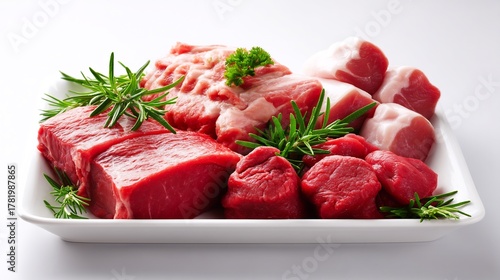 Fresh, Raw Meat Selection with Rosemary on a White Platter, Ready for Cooking.