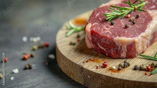 Fresh Raw Steak on Wooden Board with Rosemary and Spices