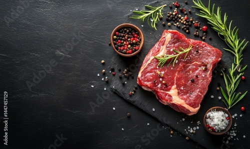 Fresh Raw Steak with Spices on Dark Stone Table for Cooking
