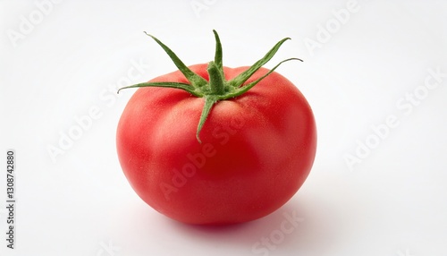 Fresh red tomato with vibrant green stem, isolated on a white background. Ideal for food packaging, healthy eating campaigns, recipe visuals, and natural product advertisements.