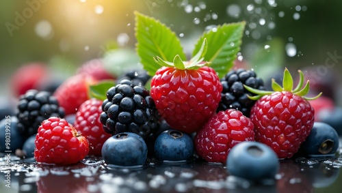 berry, raspberry, blueberry, blackberry, fresh fruit, summer fruit, health food, fruit salad, organic food, vitamin c, antioxidant, delicious, juicy, red, blue, black, green, leaf, water droplets, nature, food photography, freshness