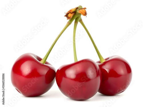 sweet, healthy, fruit, closeup, berry, red, dessert, cherry, antioxidant, ripe, delicious, stem, fresh, vitamin, cherry, organic, plant, raw, single, natural, food, juicy, macro, alimentary, three, isolated, whole, vibrant, summer, snack, detail, white background, sweet fruit, healthy eating, topview