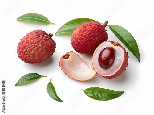 Fresh ripe lychee fruit halved showing juicy flesh and seed surrounded by leaves on a white background,png
