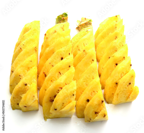 Fresh ripe pineapple, pineapple fruit slice isolated. Juicy fruit composition design element with stacked focus, white background. Tropical fruit delicious ingredients, healthy nutrition concept
