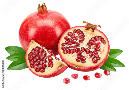 Fresh ripe pomegranate whole halved shows juicy red seeds leaves isolated white. Vibrant pomegranate fruit rich antioxidants healthy eating. Attractive pomegranate visual food blogs recipes wellness