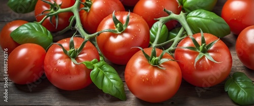 Fresh ripe tomatoes and basil leaves on a rustic wooden surface, perfect for salads, Italian cuisine, and healthy, organic cooking