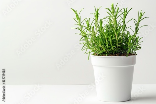 Fresh rosemary and other potted herbs creatively arranged on white background Design element for healthy eating and alternative medicine