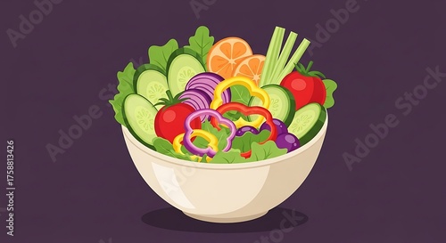 salad, food, vegetable, fresh, healthy, bowl, ingredient, organic, cookery, diet, nourishment, epicure, side, dish, meal, vegetarian, vegan, raw, crisp, crunchy, leafy, green, red, yellow, orange, purple, onion, tomatoes, cucumber, pepper, lettuce, citrous, fruit, slice, cut, preparation, cooking, kitchen, eatery, cafes, bistro, dinner, picnic, party, gathering, celebration, illustration, graphic
