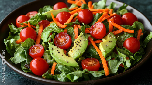 Fresh salad with avocado, cherry tomatoes, and shredded carrots on a dark plate.