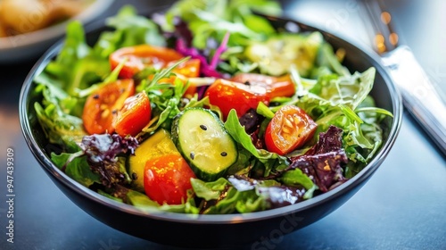 Fresh salad with cherry tomatoes, cucumber, and mixed greens in a black bowl on a table.