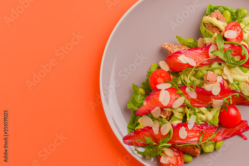 Fresh salad with smoked salted salmon, tomatoes and pumpkin seeds. Served on a gray plate over bright orange background.