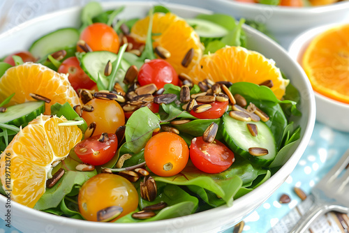 salad, spinach, tomatoes, cucumber, mandarin, orange, segment, sunflower, seed, healthy, food, fresh, delicious, vibrant, colourful, meal, diet, nourishment, eating, cookery, vegetable, fruit, citrous, summer, spring, bowl, plate, lunch, dinner, receipe, ingredient, tasty, green, red, breakfast, snack, vitamin, antioxidant, energy, wellness, lifestyle, clean, organic, natural, epicure, side, dish