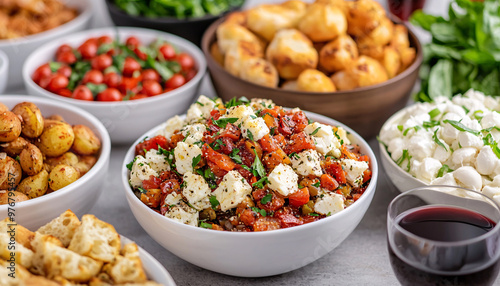 Fresh salad with tomatoes, cheese, and herbs surrounded by delicious appetizers and wine