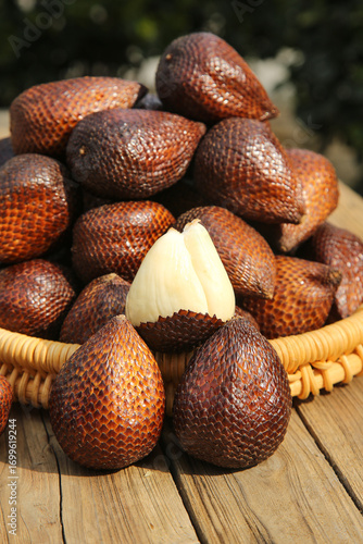 Fresh Salak Snake Fruit from Bali Indonesia in Traditional Wicker Basket on Wood