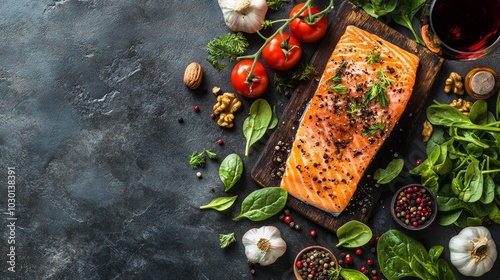 Fresh salmon fillet with spinach, tomatoes, garlic, walnuts and peppercorns on a rustic wooden board.