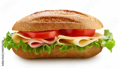 Fresh sandwich with ham, cheese, lettuce, and tomato on a baguette. Great for lunch on-the-go.