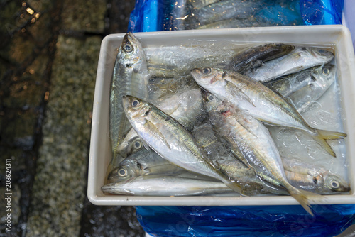 Fresh sea fishe on dish with iced in foam box on shelf of seafood shop, the tsukiji fish market, japan