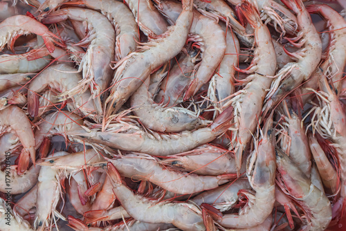Fresh sea prawns seamless background. Pile of fresh shrimps or red prawns.