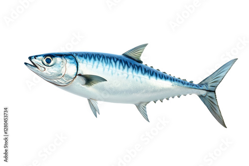 Fresh Spanish mackerel fish with detailed scales and fins isolated on white transparent background. Concept of seafood and marine life
