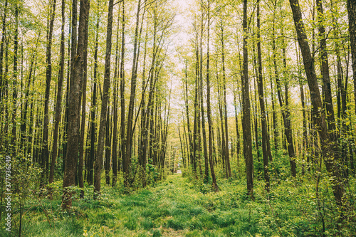 Fresh Spring Green Leaves Lush In Deciduous Forest. European Nature