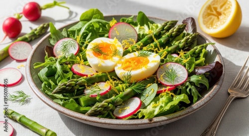 Fresh spring salad with egg, asparagus, radish, and lemon, healthy food for restaurant or recipe