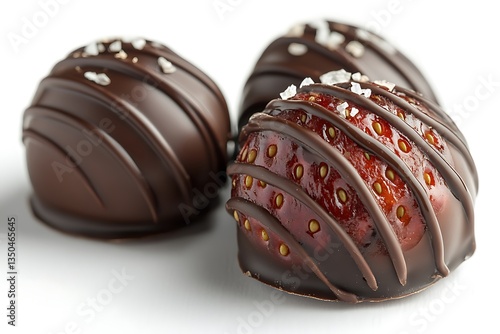 Fresh strawberries coated in chocolate, elegantly arranged against a bright surface.
