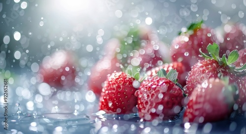 Fresh Strawberries Under Sprinkled Water Droplets in Natural Light