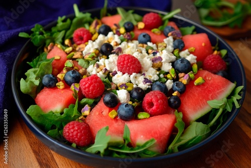 salad, summer, watermelon, greener, berry, pistachio, fresh, colourful, healthy, fruit, arugula, blueberry, raspberry, light meal, nourishment, dish, bowl, vegetarian, natural, refreshing, seasonal, epicure, picnic, snack, ingredient, culinary, homemade, appetising, delicious, aesthetic, lifestyle, cheerful, beautiful, organic, vivid colors, cooking, presentation, dining