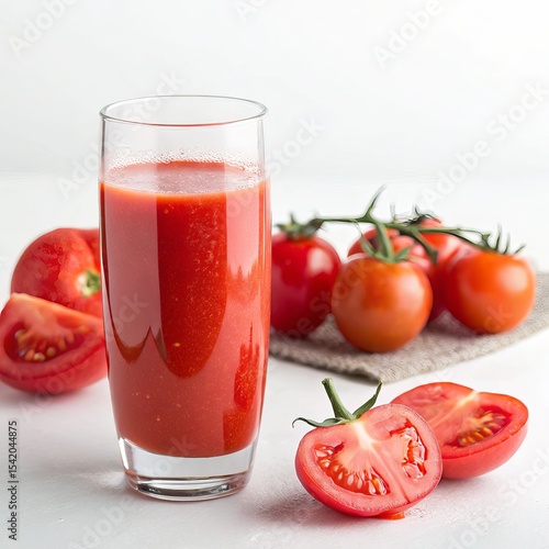 Fresh Tomato Juice Glass with Ripe Tomatoes on White, Healthy Drink, Diet