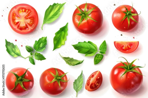 Fresh tomato plants with green leaves and visible seeds, great for gardening or cooking illustrations