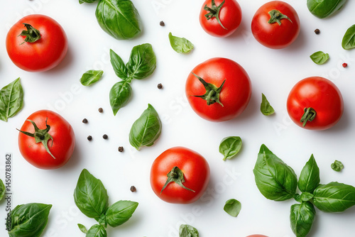 Fresh tomatoes and basil arranged on a white background in a top view layout for culinary inspiration