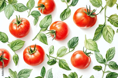 tomatoes, basil, leaf, lying, fresh, herb, plant, ingredient, isolated, raw, red, green, white, food, produce, organic, overhead, topview, still life, pattern, culinary, cooking, receipe, healthy, nourishment, vegan, vegetarian, diet, botanical, flora, tree branch, vibrant, bright, simple, minimal, watercolor, drawing, artistic, artwork